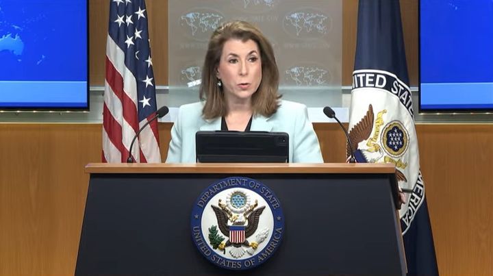 [워싱턴=뉴시스] 태미 브루스 미 국무부 대변인이 28일(현지 시간) 국무부 정례브리핑에서 발언하고 있다. (사진=국무부 유튜브 캡쳐). 2025.03.29. *재판매 및 DB 금지