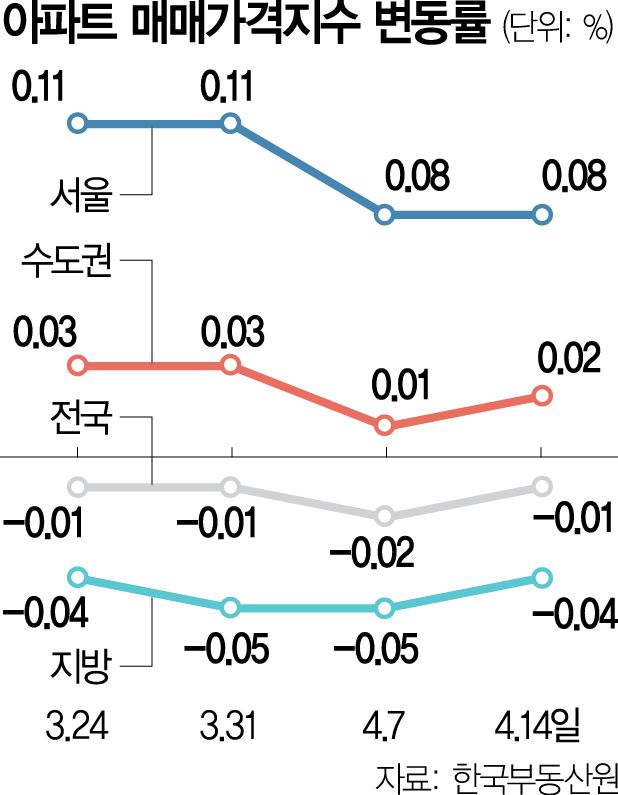 한국부동산원이 17일 발표한 '4월 둘째 주(14일 기준) 전국주택가격동향조사'에 따르면 서울 아파트값은 전주 대비 0.08% 오르며 11주 연속 상승했다. 상승 폭은 전주와 동일했다.