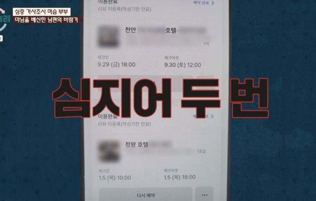 아내는 “6개월 동안 몇명 만난 거냐”며 하자 남편은 “1명이다”며 주장, 아내는 “그럼 모텔간 또 다른 여자 누구냐”라고 물었다.바로 옆동네 살던 또 다른 바람녀가 있던 것. 충남과 경기도 시흥 등 두번이나 모텔에 간 내역이 공개됐다.아내가 화를 내며 추궁해도 남편은 “기억 안난다”는 말만 당당하게 외쳤다. 남편은 “기억 안난다 과거를 잊고 앞만 보고 산다”고 말하기도. 심지어 노래방에서 바람녀와 스킨십까지 했다고 했다. 남편은 “살면서 잠깐 즐긴 것 뿐. 아내 입장에서 바람이다믿지 못하겠지만 한 명이다”라며 당당하게 말했다.