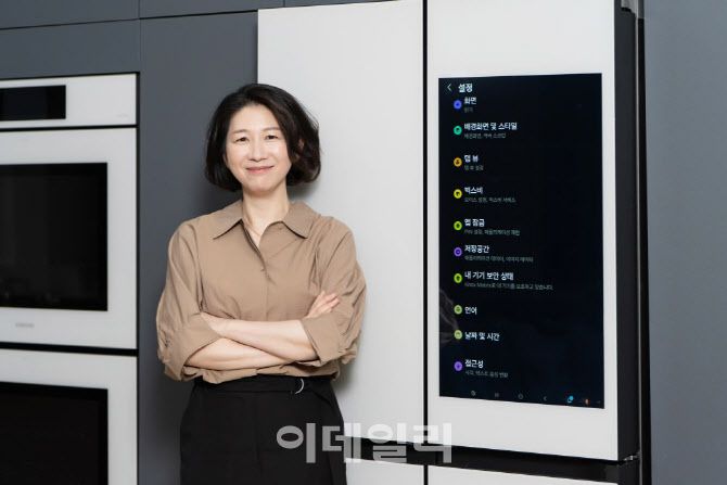 삼성전자 이보나 상무와 패밀리허브 냉장고 32형의 색상 반전 모드 적용 화면(사진=삼성전자 뉴스룸)