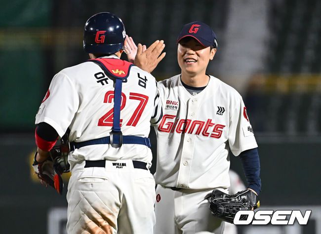 [OSEN=부산, 이석우 기자] 17일 부산 사직야구장에서 2025 신한 SOL 뱅크 KBO 리그 롯데 자이언츠와 키움 히어로즈의 경기가 열렸다. 홈팀 롯데는 박세웅, 방문팀 키움은 김윤하가 선발 출전했다.롯데 자이언츠 박진형이 키움전에서 7-1로 승리한 후 유강남과 기쁨을 나누고 있다. 2025.04.17 / foto0307@osen.co.kr |
