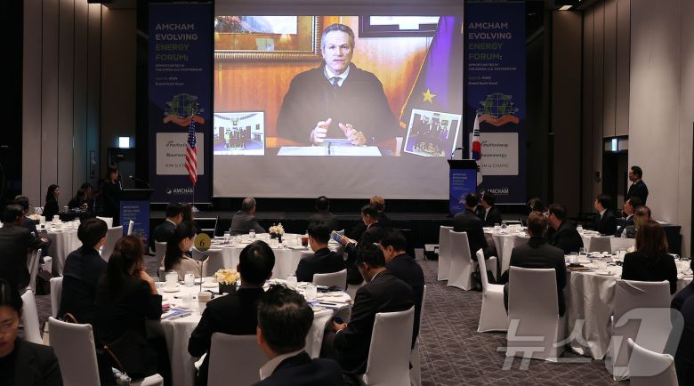 (서울=뉴스1) 김진환 기자 = 18일 서울 용산구 그랜드 하얏트 호텔에서 열린 주한미국상공회의소(AMCHAM·암참) 주최 '에너지 혁신 포럼'에서 마이크 던리비 알래스카 주지사의 영상 축사가 송출되고 있다. 2025.4.18/뉴스1kwangshinQQ@news1.krCopyright ⓒ 뉴스1. All rights reserved. 무단 전재 및 재배포, AI학습 이용 금지.이 기사의 카테고리는 언론사의 분류를 따릅니다.0공유하기
