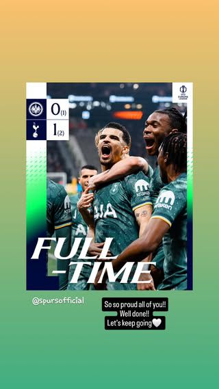 손흥민은 자신의 SNS 스토리 기능을 통해 "너희 모두가 자랑스럽다. 정말 잘했다. 계속 이렇게만 가자!"라며 동료들의 승리를 축하했다.