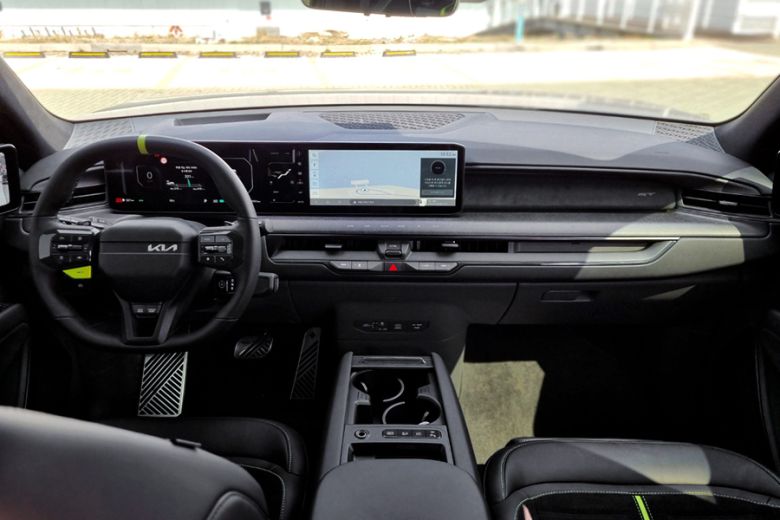 EV9 GT의 실내 공간은 최근 기아차 디자인을 잘 드러낸다. 수평적이면서도 깔끔하게 다듬어진 구성, 그리고 독특한 매력을 자아내는 스티어링 휠 등이 매력을 더한다.