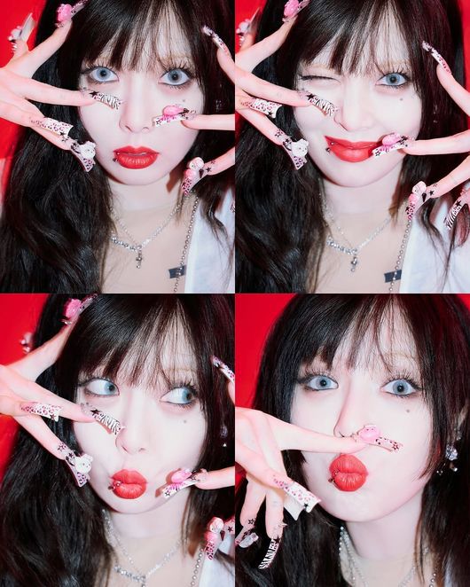 사진 속 현아는 컴백을 앞두고 물오른 미모를 자랑하고 있다. 새하얀 피부와 대비되는 레드립이 강렬한 인상을 주는 가운데 화려한 네일 아트 또한 시선을 사로잡는다. 현아는 윙크를 하는 등 여러 표정을 지어보이며 잔망스러운 매력을 자아냈다.