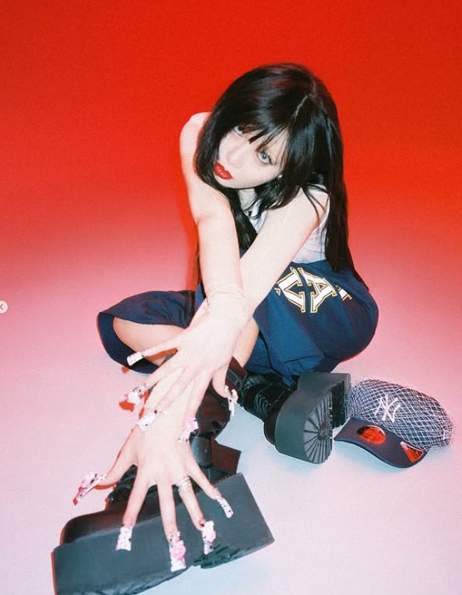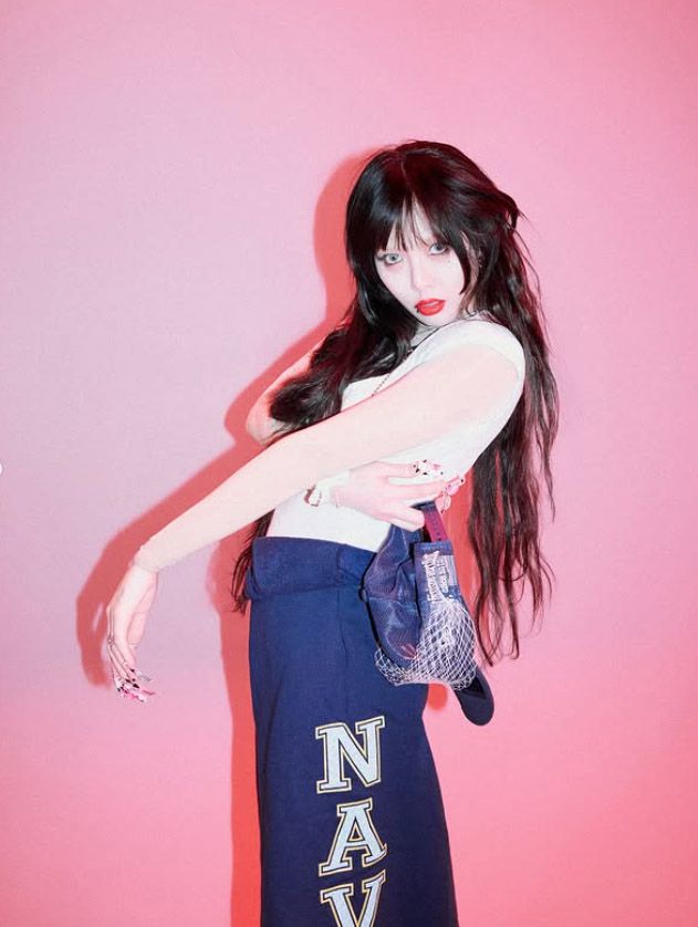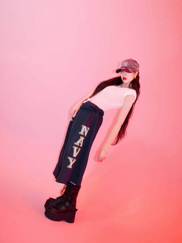 현아는 화이트 민소매 상의와 ‘NAVY’ 레터링이 돋보이는 네이비 컬러의 와이드 팬츠, 그리고 두꺼운 플랫폼 부츠를 매치해 트렌디하면서도 개성 넘치는 패션을 선보였다. 체크 패턴의 볼캡과 붉은 립, 긴 흑발 헤어가 어우러져 현아만의 카리스마가 돋보인다.