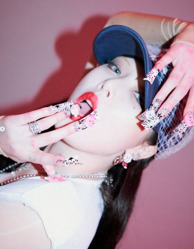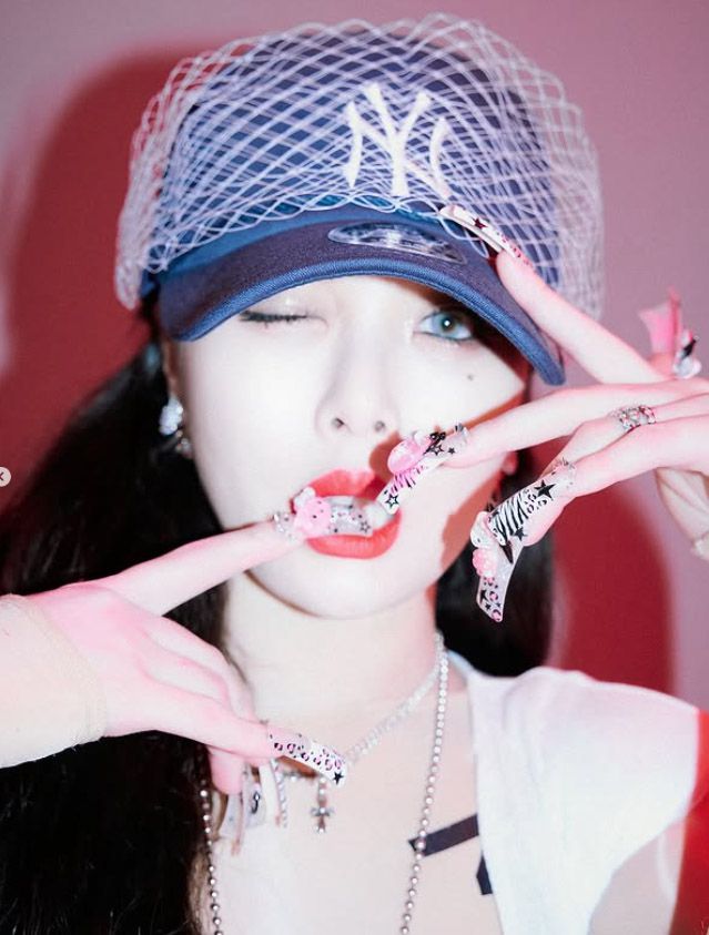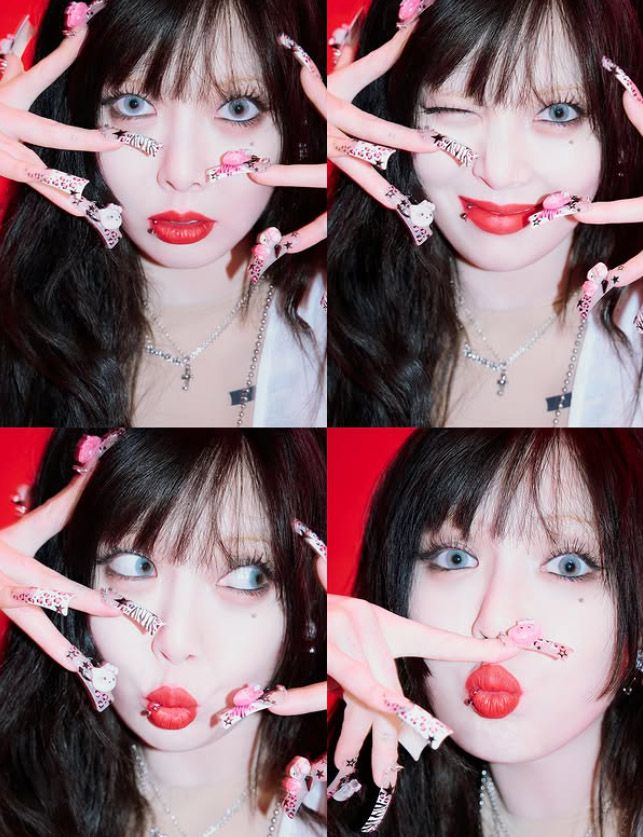 특히, 네일 아트가 강조된 클로즈업 이미지가 눈길을 끈다. 화려한 아트가 입혀진 긴 손톱과 함께 다양한 표정 연출로 현아 특유의 자유분방함과 유니크한 매력을 드러냈다. 특히 강렬한 레드 립과 블루 컬러 렌즈, 입술 피어싱 등으로 독특한 분위기를 자아낸다.