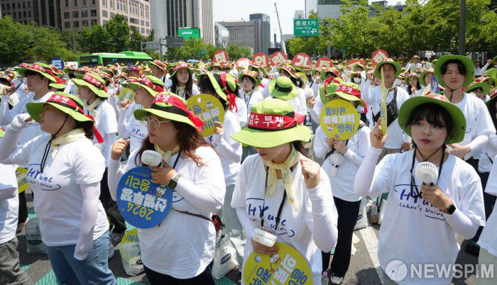 [서울=뉴스핌] 최지환 기자 = 전국보건의료산업노조 조합원들이 12일 오후 서울 종로구 동화면세점 앞에서 열린 2024 보건의료노조 총력투쟁 결의대회에서 구호를 외치고 있다. 2024.06.12 choipix16@newspim.com |