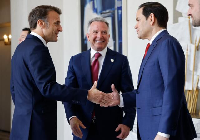 에마뉘엘 마크롱(맨 왼쪽) 프랑스 대통령이 17일 프랑스 파리 엘리제궁에서 마코 루비오(맨 오른쪽) 미국 국무부 장관과 악수하고 있다. 가운데는 미국 백악관 중동 특사인 스티브 위트코프. 파리=AP 연합뉴스 |