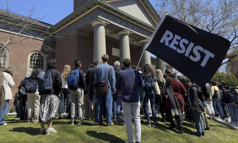 17일(현지시각) 미국 매사추세츠주 케임브리지에 하버드대 캠퍼스에서 하버드대 학생, 교수 등이 집회에 참여하고 있다. 한 남성은 ‘저항’ 이라고 적힌 깃발을 들었다. 케임브리지/AP 연합뉴스 |