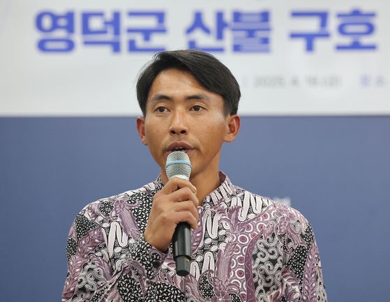 18일 경기 정부과천청사 법무부 건물에서 열린 영덕군 산불 구호 외국인 표창장 수여식에서 표창장을 수상한 인도네시아 국적 수기안토가 소감을 밝히고 있다. 연합뉴스 |