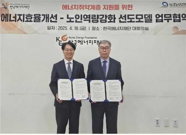 한국에너지재단 주영남 사무총장(왼쪽)과 한국노인인력개발원 김미곤 원장(오른쪽)이 18일 업무협약 체결 후 기념사진을 촬영하고 있다. [사진=노인인력개발원] 2025.04.18 sdk1991@newspim.com