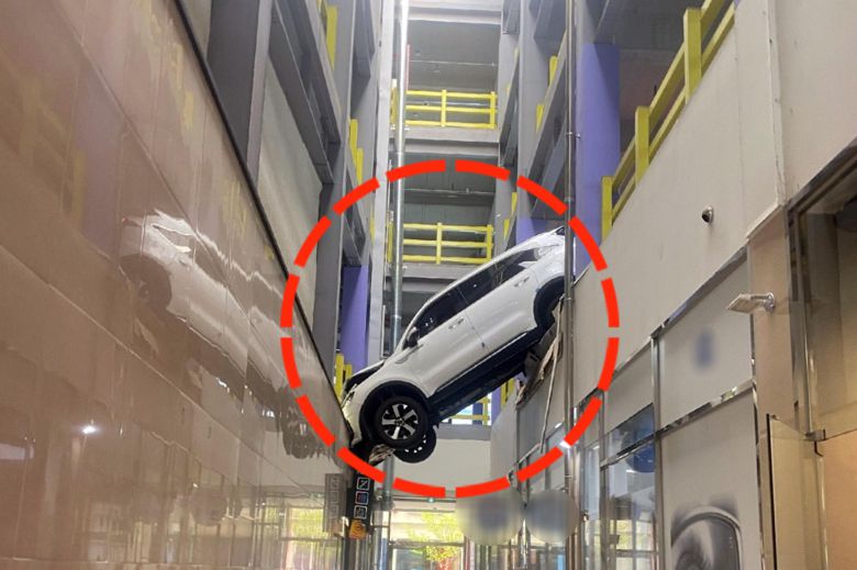 전남 순천시 한 주차타워 2층에서 스포츠유틸리티차량(SUV)이 난간 밖으로 돌진하는 사고가 발생했다.