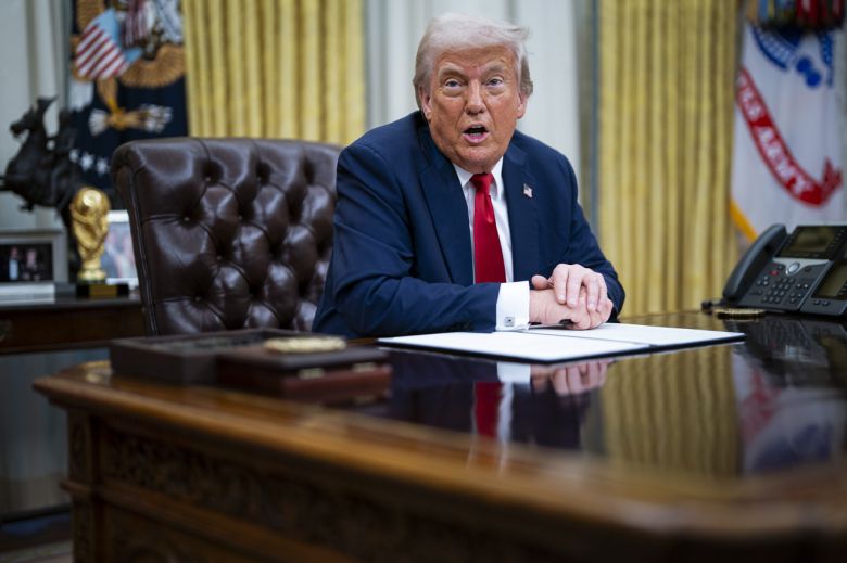 도널드 트럼프 미국 대통령이 백악관 집무실에서 취재진 질문에 응답하고 있다. [EPA]