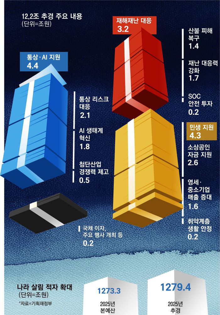 정부가 내놓은 12조2000억원 규모 추가경정예산안의 핵심 키워드는 ‘필수’와 ‘민생’이다. 산불 등 자연재해와 미국의 관세 조치 등 사회적 재난에 가까운 산업 환경 악화에 대응하는 데 필요 자금을 투입하고 고사 직전의 소상공인과 서민 생활을 안정화하기 위해 민생자금을 지원하는 것이 추경을 편성한 배경이다.