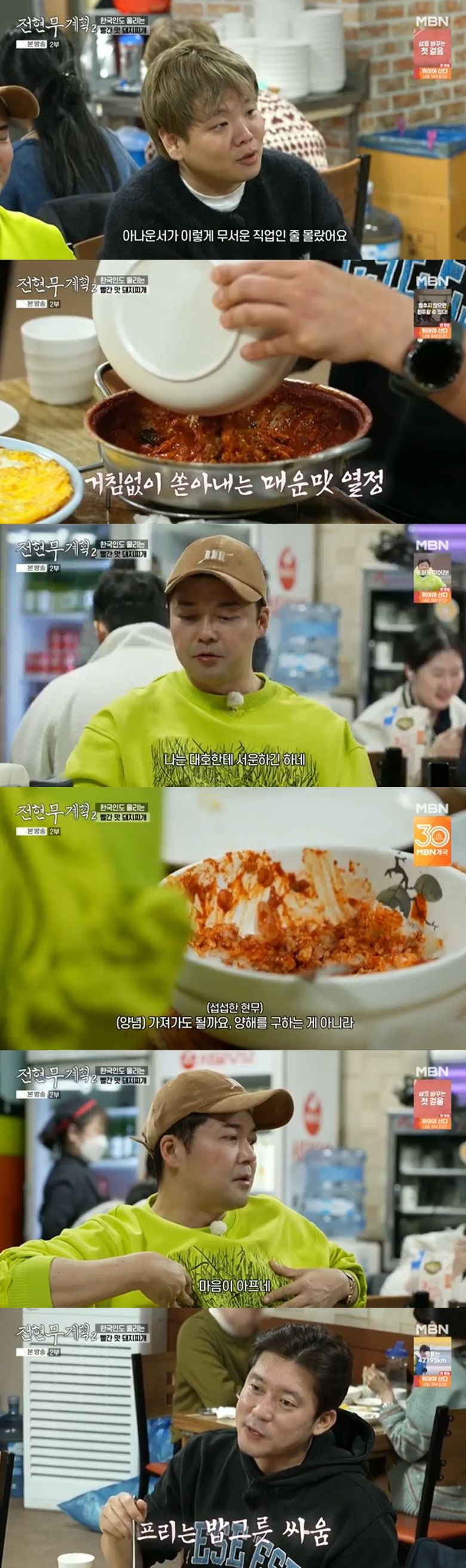 이날 김대호와 전현무는 '매운 맛' 사랑을 드러내며 빨간 맛 돼지찌게 집에 방문했다. 매운 음식에 겁을 낸 곽튜브와 달리 매운 음식에 강한 전현무와 김대호는 만족을 표했다.