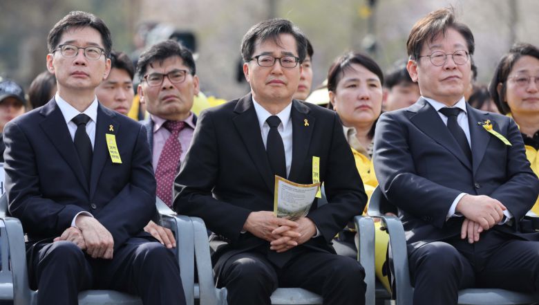 16일 안산시 단원구 화랑유원지에서 열린 세월호 참사 11주기 기억식에 참석한 (왼쪽부터) 김경수 전 경남지사와 김동연 경기도지사, 이재명 더불어민주당 전 대표가 추도식을 듣고 있다. 신태현 기자 holjjak@