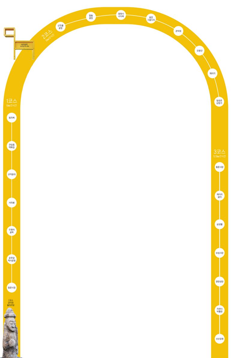 수많은 설화가 덧입혀진 건입동 벽화길을 지나면 100년이 훌쩍 넘은 산지등대가 나타난다. 등대 앞바다를 내려다보며 깊이 잠들어 있을 성벽 바윗돌들을 떠올려본다. 사라봉 아랫자락에는 제주 항일의 역사가 깃든 모충사가 자리해 있다. 정겨운 벽화들이 그려진 두맹이골목과 운주당지구역사공원을 거쳐 동문시장에 접어들면 길은 얼추 마무리된다.