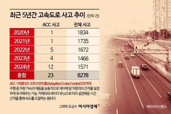 19일 한국도로공사에 따르면 ACC를 사용하다 난 사고는 2020년 1건, 2021년 각 1건 정도에 불과했다. 그러다 이듬해 5건, 2023년 4건, 지난해에는 12건으로 급증했다. 최근 5년간 사망자는 19명에 달한다. 같은 기간 고속도로 내 전체 교통사고는 1834건(2020년)에서 1571건(2024년)으로 점점 줄어드는 추세다.