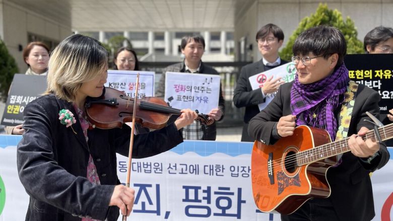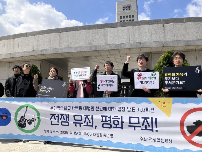 ‘전쟁없는세상’ 활동가들이 2025년 4월15일 대법원에서 기자회견이 끝난 뒤, 2022년 무기박람회 현장에서 연주했던 곡을 연주하고 있다. 전쟁없는세상 제공
