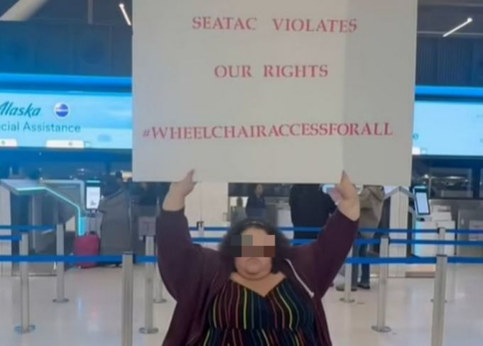 관련 사진을 보면 A씨는 "시애틀 터코마 공항이 우리의 권리를 침해한다"(SeaTac violates our rights)라는 문구가 적힌 피켓을 들고 공항 측에 항의하고 있다.