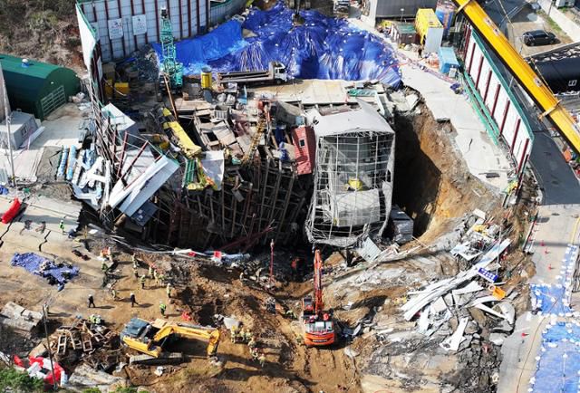 붕괴 사고가 발생한 경기도 광명시 신안산선 지하터널 공사 현장에서 16일 구조대원들이 현장을 살펴보고 있다. 지난 11일 경기도 광명시 신안산선 복선전철 제5-2공구 지하터널 공사 현장과 상부 도로가 함께 붕괴하는 사고가 났다. 연합뉴스