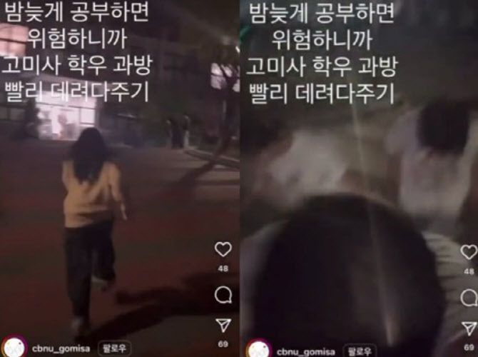 [이데일리 이로원 기자] 고려대·충북대·한밭대에 재학중인 남학생들이 소셜미디어에 ‘밤에 모르는 여자 집 바래다주기’ 영상 콘텐츠를 게재하며 스토킹 범죄를 웃음 소재로 삼아 공분을 사고 있다. 영상 속 남학생이 여학생을 뒤쫓는 모습을 약 10초간 담고 있어 스토킹 범죄를 연상시킨다는 지적이 일고 있는 것. 해당 영상이 논란에 휩싸이자 이들은 영상을 삭제하고 “경솔했다”며 공식 사과했다.