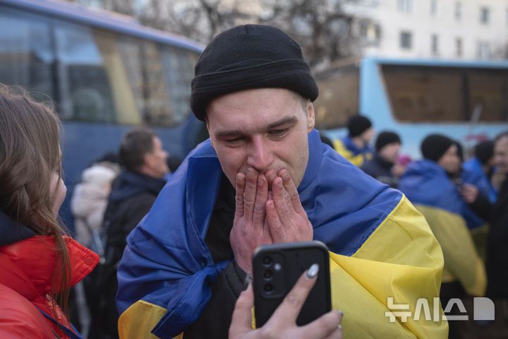 [체르느히우=AP/뉴시스] 19일(현지 시간) 러시아와 우크라이나 간 포로 교환을 마치고 체르느히우로 귀환한 우크라이나 군인이 가족과 영상 통화를 하면서 눈물을 흘리고 있다. 러시아와 우크라이나는 이날 전쟁포로 175명씩을 맞교환했다. 2025.03.20