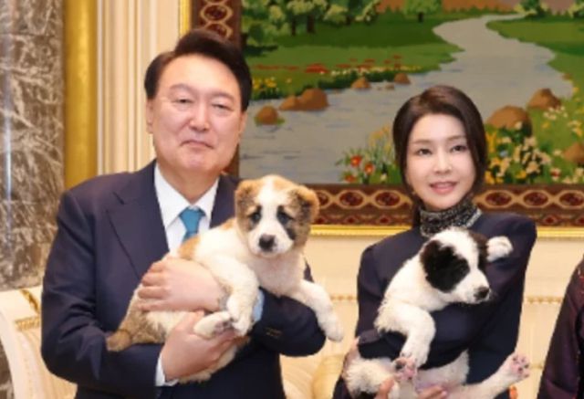 ▲윤석열 전 대통령과 김건희 전 코바나 대표가 투르크메니스탄 정상으로부터 받은 선물인 국견 두 마리를 안고 있다. ⓒ대통령실 |