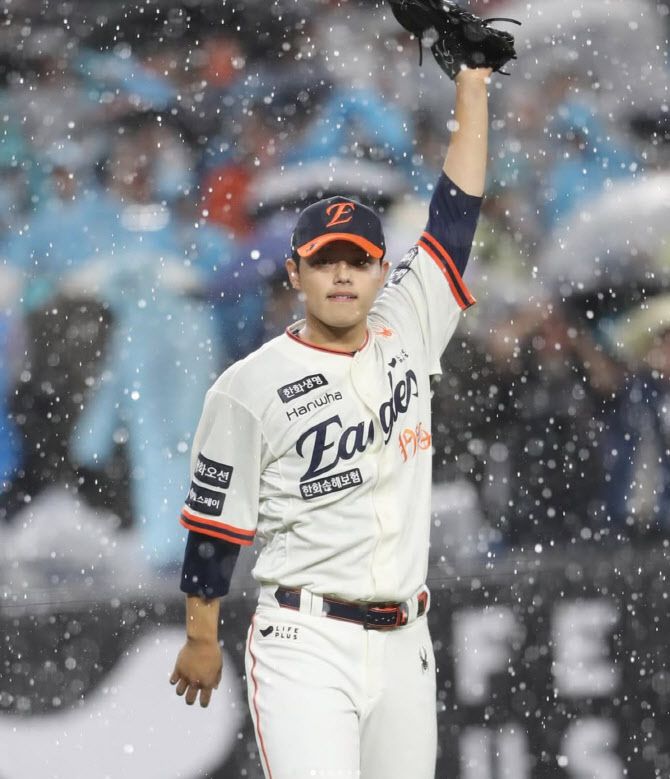 한화이글스 선발투수 문동주가 빗속에서 역투를 펼친 뒤 기뻐하고 있다. 사진=한화이글스 |