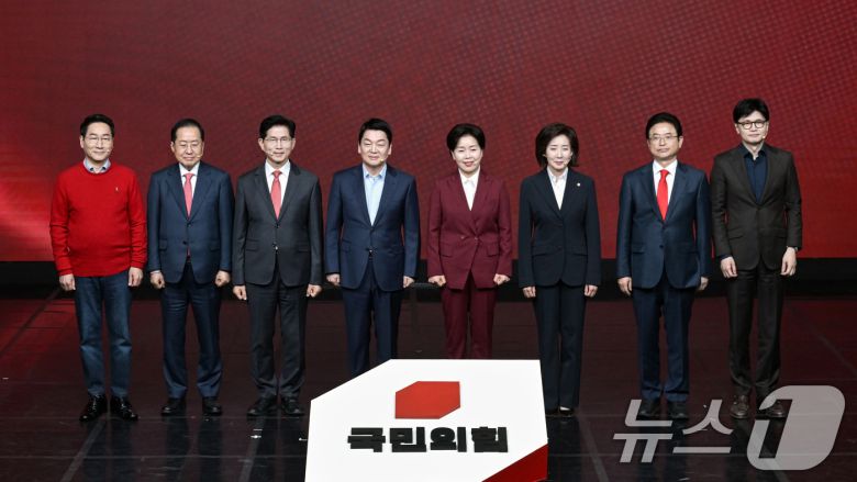 18일 서울 강서구 ASSA 아트홀에서 열린 ‘제21대 대통령 후보자 국민의힘 1차 경선 후보자 비전대회’에서 후보자들이 기념촬영을 하고 있다. 왼쪽부터 유정복, 홍준표, 김문수, 안철수, 양향자, 나경원, 이철우, 한동훈 후보. (공동취재) 2025.4.18/뉴스1 ⓒ News1 이재명 기자 |