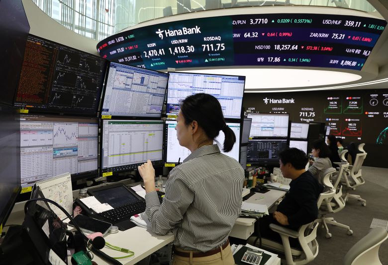 17일 서울 하나은행 본점 딜링룸에서 딜러들이 업무를 보고 있다. /연합뉴스 |