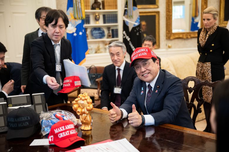 백악관은 19일 뉴스레터에서 지난 16일 일본 아카자와 료세이 경제재생상이 MAGA 모자를 쓰고 환하게 웃으며 양손의 엄지손가락을 치켜세우고 있는 사진을 배포했다. 당시 예고 없이 직접 미·일 관세 협상에 참석하겠다며 백악관 집무실로 아카자와를 불러 면담한 트럼프는 현장에서 MAGA 모자에 친필 사인을 해준 뒤 아카자와에게 모자를 건넸다. 트럼프의 선거 캠페인 구호가 적힌 모자가 일본을 대표하는 장관급 인사의 머리에 올라간 순간이었다.