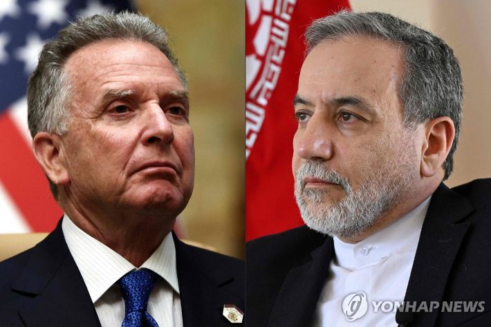 2025년 2월 18일 촬영된 미국 대통령 중동 특사 스티브 위트코프(왼쪽)의 모습과 2025년 3월 7일 촬영된 이란의 압바스 아락치(오른쪽) 외무장관의 모습을 나란히 배치한 합성사진. 연합뉴스