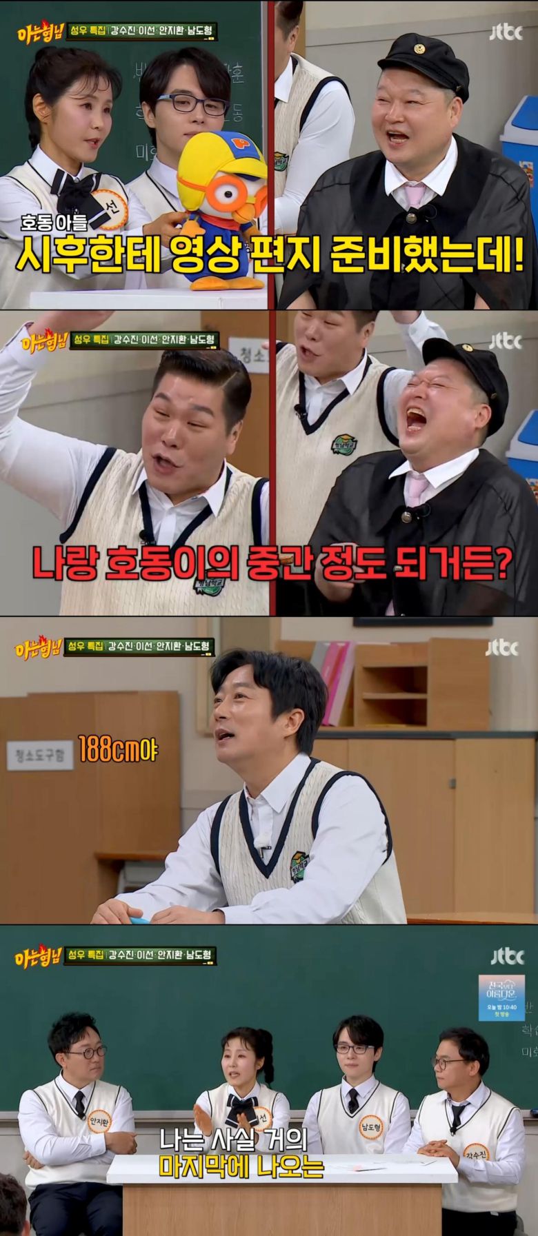 이때 김희철은 방송을 보는 아이들을 향한 메시지를 부탁했고, 이선은 "그럴 줄 알고 준비했다. 그런데 내가 시후한테 영상 편지를 준비했다"면서 강호동의 아들을 언급했다. 그러자 서장훈은 "미안한데 지금 시후 덩치가 나랑 호동이의 중간 정도다. 발 크기가 나랑 같다"며 폭풍성장한 근황을 전했다. 이에 이수근은 "188cm"라고 정확한 신장을 공개했다.