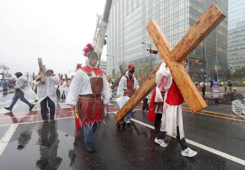 19일 서울 종로구 광화문광장에서 열린 '2025 부활절퍼레이드'에서 참가자들이 이동하고 있다. |