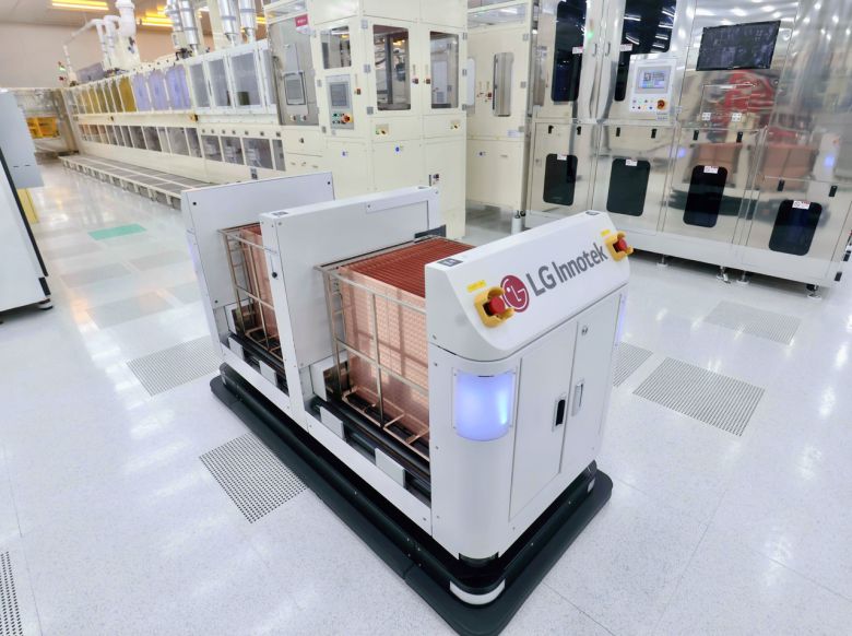 경북 구미에 위치한 LG이노텍 드림 팩토리는 기존 공장보다 작업자 수를 50% 줄이고 로봇과 인공지능(AI) 기술로 대체했다. 사진은 자동로봇(AMR)이 고성능 반도체 기판 FC-BGA 자재를 운반하는 모습. [LG이노텍 제공] |