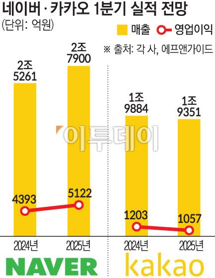 국내 양대 포털 네이버와 카카오의 올해 1분기 실적이 엇갈릴 전망이다. 네이버는 주요 캐시카우인 광고와 커머스 성장에 힘입어 분기 최대 매출 기록을 경신할 것으로 전망되는 반면 카카오는 부진이 장기화할 것으로 보인다. 다만 하반기부터 인공지능(AI) 서비스의 본격 출시로 양사 실적이 나란히 상승할 것이라는 전망이 나온다.