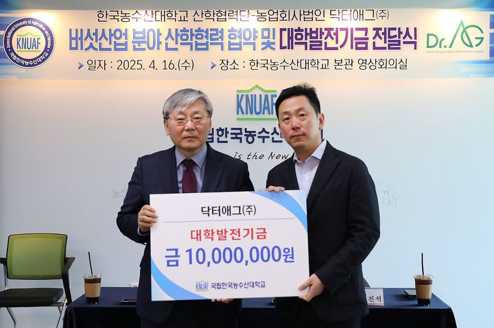 협약식 직후 닥터애그는 한농대의 버섯산업 인재양성과 교육프로그램 개발 지원을 위해 대학발전기금 1000만원을 기탁했다.