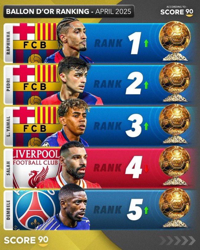 올 시즌 '미친' 활약으로 발롱도르 유력 후보에 든 하피냐다. 축구 통계 매체 '스코어 90'에 따르면 4월 기준 발롱도르 수상이 가장 유력한 선수로 하피냐가 언급됐다. 2위 페드리, 3위 야말이 뒤를 이었다.