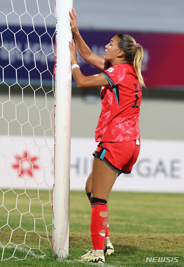 [이천=뉴시스] 황준선 기자 = 지난해 4월5일 경기 이천시 이천종합운동장에서 열린 신세계 이마트 초청 여자 축구 국가대표 대한민국과 필리핀의 친선경기, 후반 한국 케이시 유진 페어가 오프사이드 판정에 아쉬워하고 있다. 2024.04.05. hwang@newsis.com