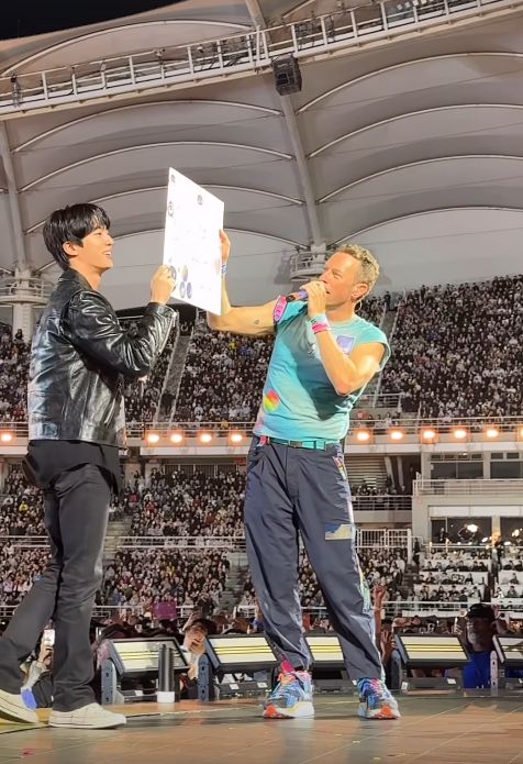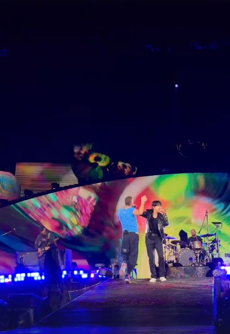 진은 지난 19일 경기 고양시 고양종합운동장에서 개최된 콜드플레이 내한 공연 '뮤직 오브 더 스피어스 월드투어(Music Of The Spheres World Tour)'에 깜짝 등장했다.