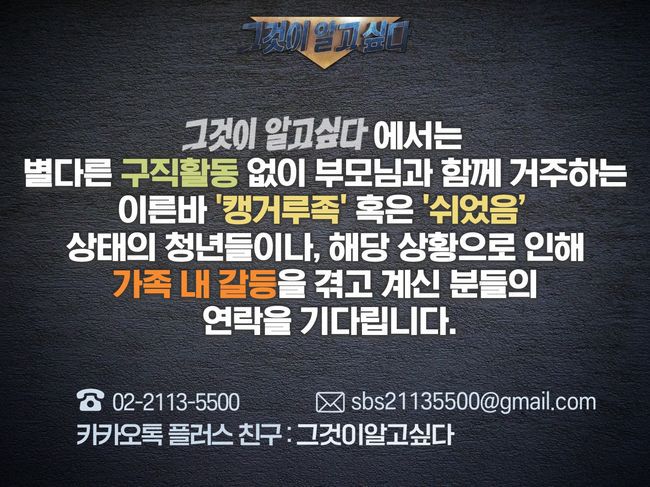 지난 19일 오후 SBS '그것이 알고 싶다(약칭 그알)' 제작진은 공식 SNS 계정을 통해 '캥거루족'에 관한 제보를 받는다고 밝혔다.