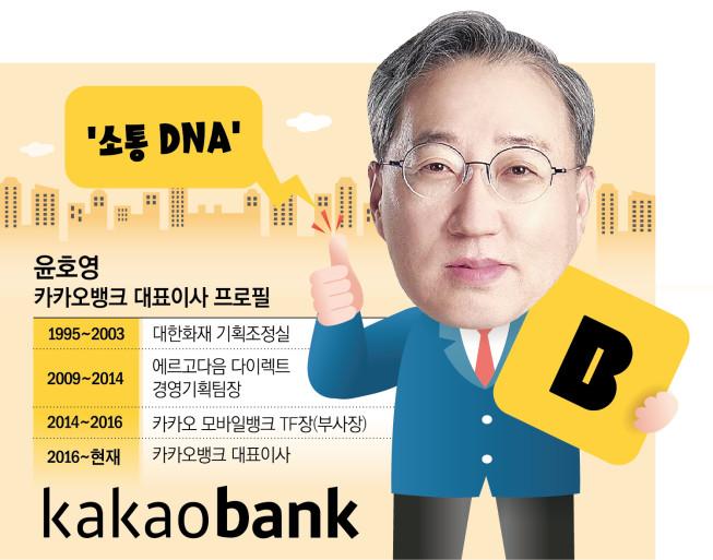 윤호영 카카오뱅크 대표의 카카오톡 프로필 메시지다. 이 한마디에는 그의 리더십과 조직문화에 대한 철학이 고스란히 담겨 있다. 윤 대표는 남들이 가지 않은 길을 개척하며 전통 금융과 정보기술(IT)의 경계를 허문 대표적인 인물로 꼽힌다. 보험, IT, 통신, 금융을 두루 거친 그는 2014년 카카오 모바일뱅크 TF(태스크포스)장을 맡으며 카카오뱅크 설립 프로젝트를 시작했다. 당시 은행업 진출은 ‘무모한 도전’으로 여겨졌지만 특유의 추진력과 설득력으로 조직을 이끌었다.
