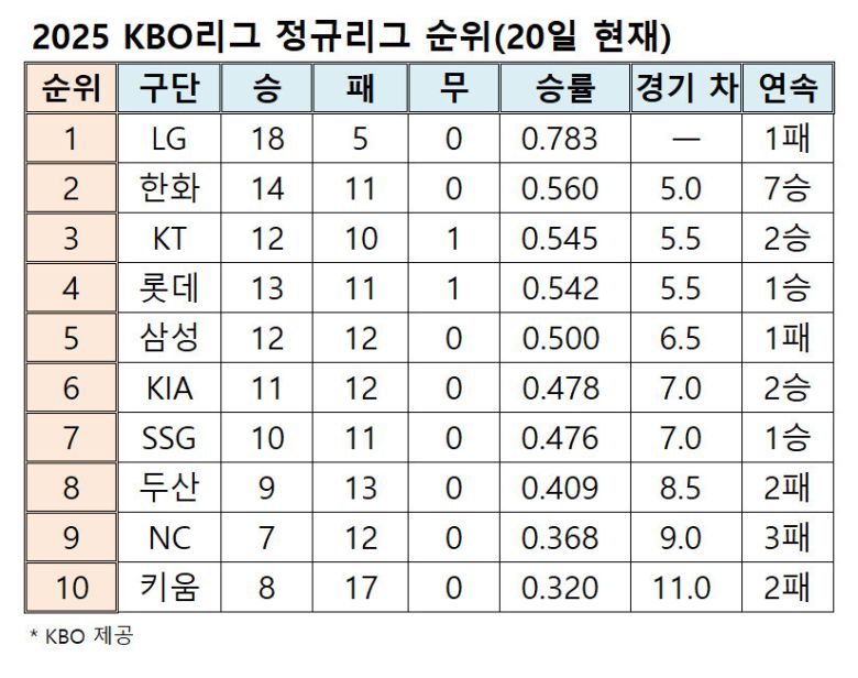 2025 프로야구 순위표(20일 현재)