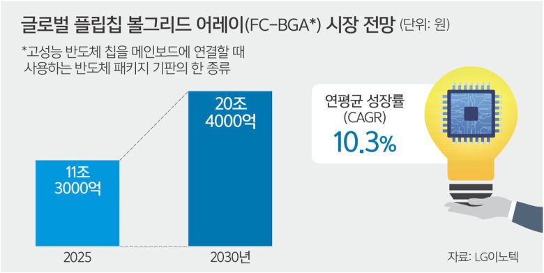 FC-BGA는 반도체 칩과 메인보드를 연결하는 반도체 패키지 기판의 한 종류다. 일반 기판보다 신호 전달이 빠르고 전기 손실이 적은 최첨단 기판으로 꼽힌다. 최근 AI 기술 발전으로 수요가 증가하면서 올해 관련 시장 규모는 11조3000억원에 달하고, 2030년까지 매년 두 자릿수 성장(연평균 10.3%)을 기록하며 20조4000억원까지 커질 것으로 내다본다.