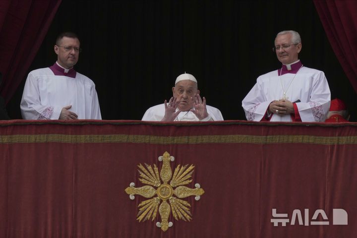 [AP/뉴시스] 프란치스코 교황이 부활절 20일 성베드도 대성당 중앙 로지 발코니에 나와 축복을 내리고 있다. 20분 간 추기경이 교황의 대세계 부활절 메시지를 낭독했다 |