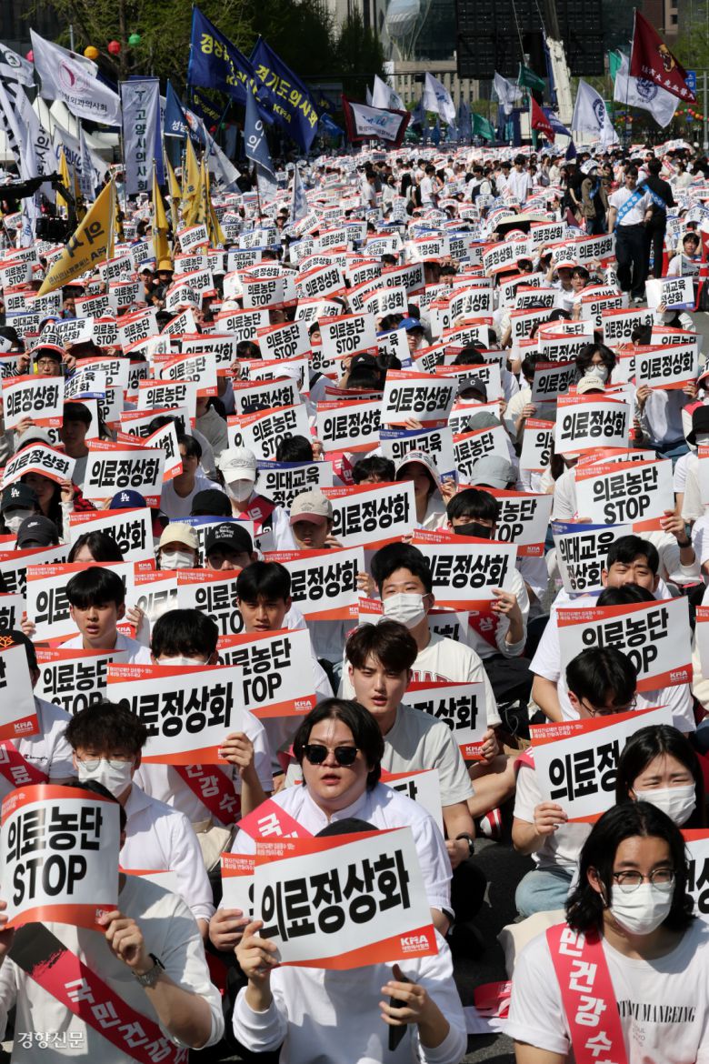 김택우 의협 회장은 “의사궐기대회는 단순한 시위가 아닌 후배들이 돌아올 수 있는 명분을 우리 손으로 만들어주는 자리”라며 “교육부, 복지부, 정부 당국은 잘못을 인정하고 책임 있는 사과와 수습책을 제시해야 한다”고 말했다. 박단 대한전공의협의회 비상대책위원장은 “우리가 무엇을 그렇게 잘못했느냐”며 “윤석열, 한덕수, 조규홍 등의 정책 실패로 지난 한 해 동안 3조5000억원의 세금이 증발했는데 정부는 왜 정책 실패와 예산 낭비를 인정하지 않느냐”고 했다. 박 위원장은 “의료체계를 개선하지 않고 단지 의사 수만 늘린다면 건보 재정이 고갈돼 의료민영화에 다가가거나 젊은 세대의 건강보험료가 두 배, 세 배 늘어날 것”이라고 했다.