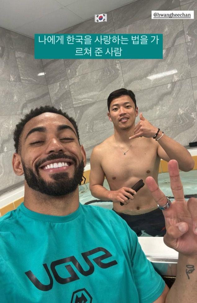 울버햄튼 공격수 쿠냐는 20일(한국시간) 자신의 SNS에 황희찬과 함께 한 사진을 게시하면서 한글로 멘트를 남겼다. 쿠냐는 "나에게 한국을 사랑하는 법을 가르쳐 준 사람"이라며 황희찬과 익살스럽게 웃고 있는 사진도 게시했다. 태극기 이모티콘도 있었다.