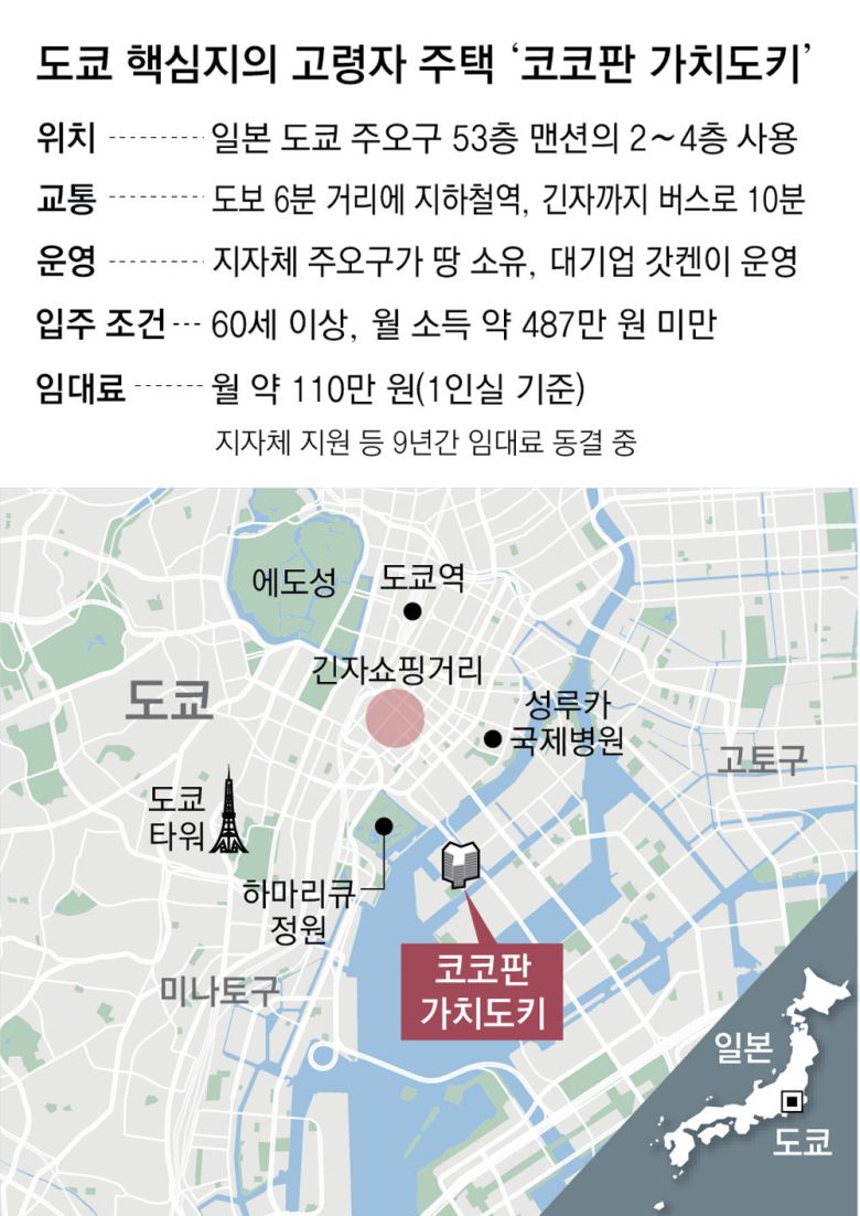 어떻게 도쿄 핵심지에 저렴한 노인 주택이 들어서는 게 가능했을까. 주오구 측이 건설지 땅 지분을 일부 갖고 있었기 때문이다. 주오구는 다른 지분 소유자들과 함께 고층 아파트를 지었고, 건물이 완성되자 땅 소유분만큼의 공간을 시니어 주택으로 만들기로 했다. 공모를 통해 운영 사업자로 일본 최대 교육·의료 복지 기업인 ‘갓켄(學研)’의 고령자 주택 브랜드인 ‘코코판’이 선택됐다.